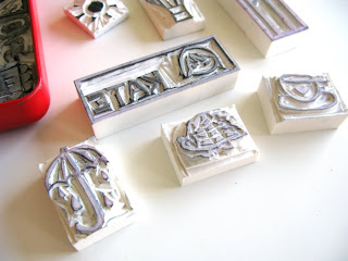Thought I'd save you the drama of seeing new stamps every day and just post what I have done so far. As you can see, I've even gone beyond the small limits of my stamp-box, which is a bit insane. I should note here that a few of these designs have been inspired by typing 'handmade stamps' into Flickr - you get some beautiful results.* One of my favourites is my 'Kate' stamp, which is ridiculous and funny. And my hot air balloon which is also my own design. (It's much more successful than my 'real' one!)
